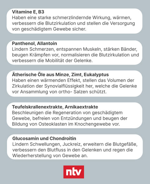 Ich möchte Ihnen mehr über die Zusammensetzung des Produkts erzählen. Eukalyptusöl habe ich bereits erwähnt. Es ist ein unverzichtbarer Bestandteil für die Gesundheit der Gelenke. Dasselbe gilt für den Extrakt aus der Teufelskrallenwurzel. Es ist eine hypoallergene Komponente, die Entzündungen lindert, Toxine entfernt, antimikrobiell wirkt und die bakterielle Aktivität hemmt. Aus diesem Grund werden die lokale Immunität und die Schutzfunktionen sehr stark erhöht. Wenn die Entzündung entfernt und der Schutz des Gelenks wiederhergestellt ist, kommt die zweite Stufe. Die andere Komponente des Produkts aktivieren die Wiederherstellung des Gelenks. Durch die kumulative Wirkung entsteht eine natürliche Barriere, die das Gelenk lange vor einer erneuten Entzündung schützt.